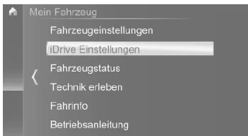 Nach Auswahl eines Menüpunkts, z. B. "iDrive Einstellungen", wird eine neue Tafel angezeigt.