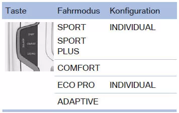 Die individuelle Konfiguration des Fahrmodus wird für das momentan verwendete Fahrerprofil gespeichert. Die zuletzt eingestellte Konfiguration wird bei erneutem Aufrufen des Fahrmodus direkt aktiviert.
