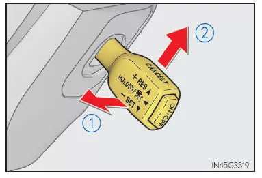 Im Konstantgeschwindigkeitsregelungsmodus wird die eingestellte Geschwindigkeit wie folgt erhöht bzw. verringert: Feineinstellung: Bei jeder Hebelbetätigung um 1 km/h (0,6 mph)*1 bzw. 1 mph (1,6 km/h)*2 Grobeinstellung: Solange der Hebel gedrückt gehalten wird, ändert sich die Geschwindigkeit.