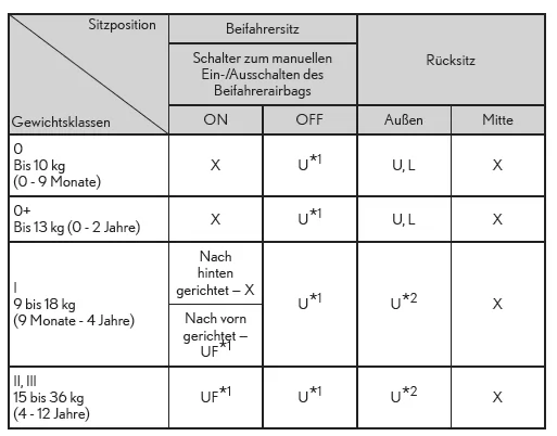 Bedeutung der Abkürzungen der obigen Tabelle: IUF: Geeignet für nach vorn gerichtete ISOFIX-"Universal"-Kindersitze, die für diese Gewichtsklasse zugelassen sind.
