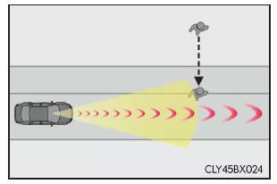 Das Pre-Crash-Sicherheitssystem erfasst mithilfe eines Radarsensors und eines Kamerasensors Fahrzeuge und Fußgänger*1, die sich vor Ihrem Fahrzeug befinden. Wenn das System feststellt, dass eine hohe Wahrscheinlichkeit für einen Frontalzusammenstoß mit einem Fahrzeug oder Fußgänger besteht, wird eine Warnung ausgegeben, die den Fahrer dazu auffordert, Maßnahmen zur Vermeidung einer Kollision zu ergreifen; außerdem wird der potenzielle Bremsdruck erhöht, um dem Fahrer bei der Vermeidung der Kollision zu helfen.