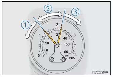 - Wenn der Reifendruck weniger als 130 kPa (1,3 kgf/cm2 oder bar) beträgt: Der Reifen kann nicht repariert werden. Wenden Sie sich an einen Lexus-Vertragshändler bzw. eine Vertragswerkstatt oder an eine andere qualifizierte und entsprechend ausgerüstete Fachwerkstatt.